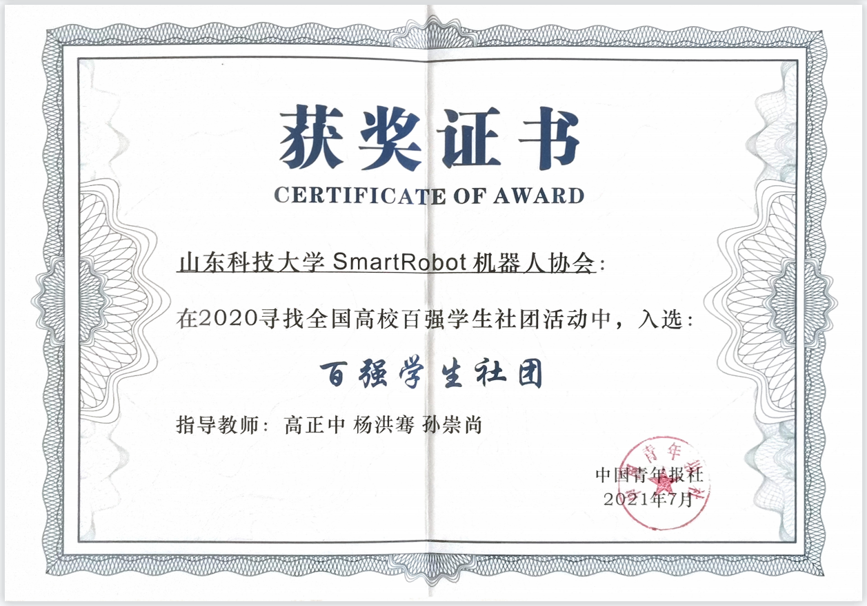 近日,由全国学联秘书处指导、中国青年报社主办的“2020寻找全国高校百强学生社团”活动评选结果揭晓,ac米兰官网中文网站SmartRobot机器人协会经过学校推荐、社团展示、网络投票、技术筛查、专家评审等环节,从来自全国各地1014所高校的3871个学生社团中脱颖而出,入选“2020年全国高校百强学生社团”。