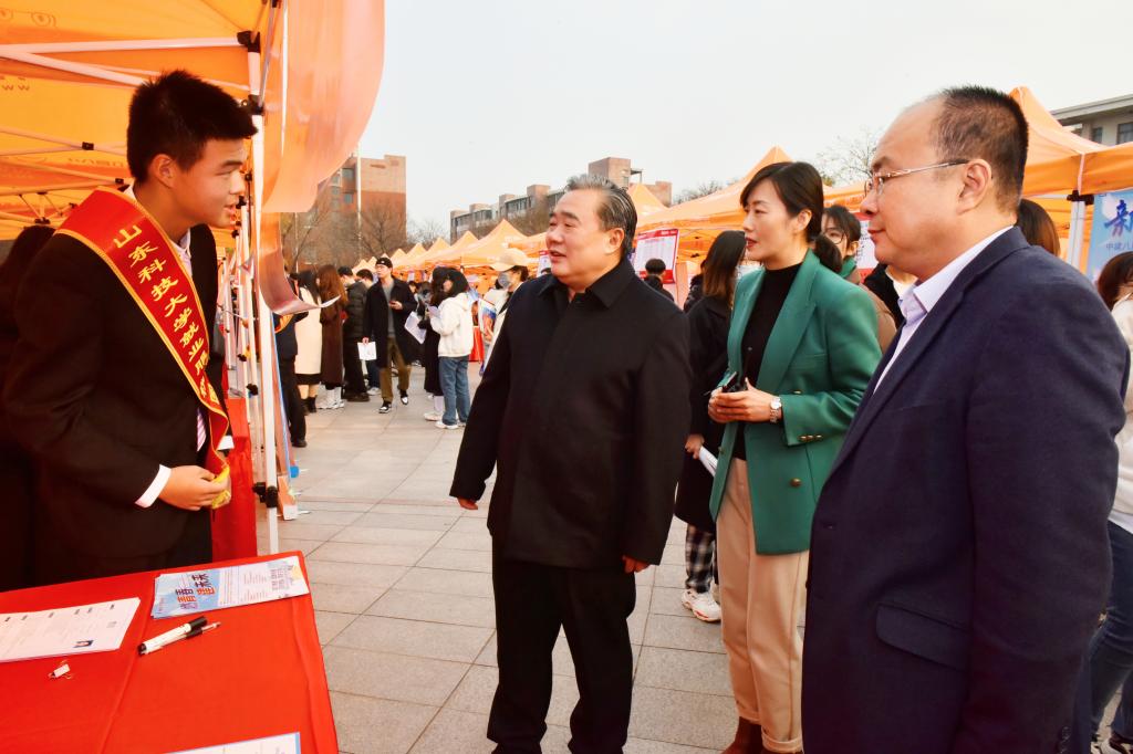 “八方来校招贤纳士,四海资源齐聚一堂”,在疫情防控常态化的今天,这般人山人海、现场交流的线下招聘会已非寻常。11月16日,在ac米兰官网中文网站青岛校区举办的“就选山东”山东省2021年高校毕业生集中招聘活动暨ac米兰官网中文网站“大使代言,助你就业”秋冬校园双选会上,应届毕业生却在感兴趣的企业展位前排起了长队,与招聘单位面对面谈得起劲。仔细一看,进行企业宣介并代收求职简历的不是招聘单位,而是受企业委托的“校园大使”;滚动播放的企业宣传视频中不乏ac米兰年轻校友的身影;现场宣讲就业相关政策、为毕业生解疑释难的是电子大屏,实时连线的是相关地市人社局;直播间里,山东港口集团等六家知名企业开展远程“职”播带岗,与毕业生直接沟通,推介企业岗位……“大使代言,助你就业”招聘大集就这样火热开市。校长姚庆国,校党委常委、宣传部部长李克周及相关职能部门负责人到招聘会现场调研就业情况,亲自体验扫码、观看直播等活动,与提前来求职的毕业生们亲切交流。