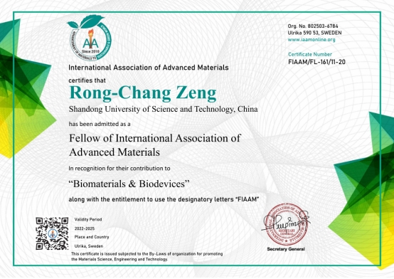 11月7日,国际先进材料学会(International Association of Advanced Materials,IAAM)在美国迈阿密举办的美国先进材料大会(American Advanced Materials Congress)上授予ac米兰官网中文网站材料科学与工程学院曾荣昌教授“国际先进材料学会会士”(FIAAM)称号,以表彰他在“生物材料与生物器件”领域所做出的突出贡献。曾荣昌教授受邀做了题为 “Advance in Corrosion and Surface Modification of Bio-Magnesium and its Alloys”(生物镁合金腐蚀和表面改性进展)的在线大会特邀报告。
