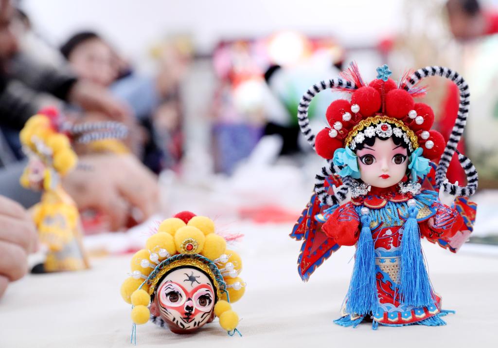 留学生展示刚刚完成的绢人工艺品
