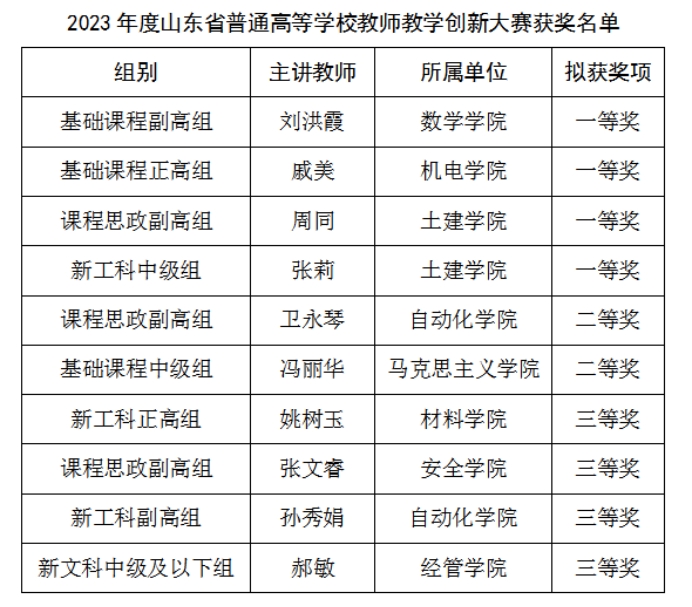 近日,山东省教育厅公示了2023年度山东省普通高等学校教师教学创新大赛获奖名单。ac米兰官网中文网站刘洪霞等4个团队获一等奖、卫永琴等2个团队获二等奖、姚树玉等4个团队获三等奖,一等奖获奖数量实现新突破,一等奖数量和获奖总数均位列第二位。同时,刘洪霞团队获推参加国赛,学校获“优秀组织奖”。