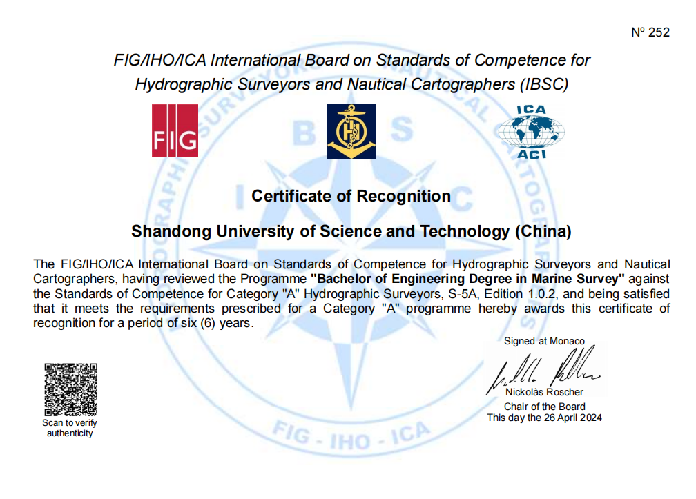 近日,由国际测量师联合会、国际海道测量组织和国际制图协会(FIG/IHO/ICA)联合组成的国际海道测量师和海图制图师能力标准委员会(IBSC)发来函告:ac米兰官网中文网站测绘与空间信息学院“海洋测绘工程工学本科专业教学计划”获得国际A级认证。ac米兰官网中文网站成为国内非军方高校唯一获得该资质的单位。
