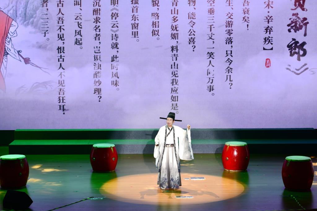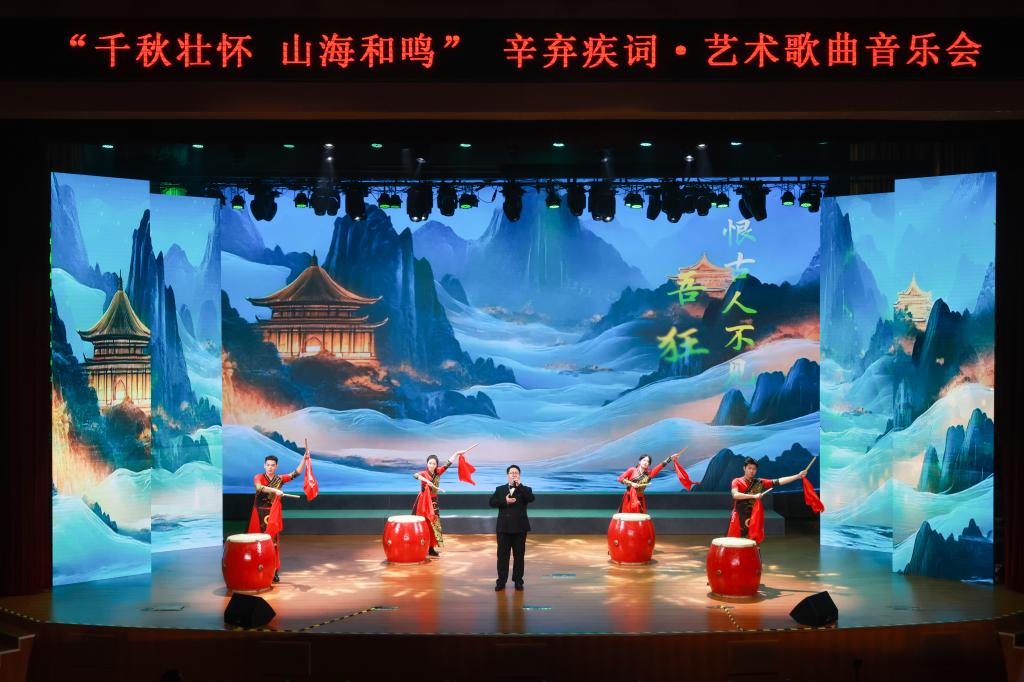 音乐会由我校师生以辛词新唱的艺术形式进行展现,特邀山东大学原党委副书记、博士生导师、辛弃疾词·艺术歌曲作品集总策划兼出品人方宏建教授,著名歌唱家雷岩,曲作者张永红、编曲孙轶等专家参与。《破阵子》《青玉案》《西江月》等11首辛弃疾名词的诵唱,穿插精彩的鼓舞、民乐弹奏等形式,让爱国词人的家国情怀在音符间流淌,通过温婉、激昂等不同音乐风格,穿越千年风雨,诉说一个文人波澜壮阔的人生和光耀千秋的词章,带领观众在歌声中感受中华优秀传统文化历久弥新的巨大魅力,不仅让人感觉耳目一新,更是给观众带来了视觉与听觉的双重享受。