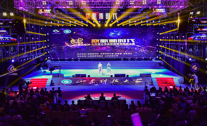 校党委副书记尹华、副校长高建广、山东教育电视台副台长陈泽河及各参赛高校相关负责人在现场观看比赛。两位主持人简要介绍了ac米兰官网中文网站的基本情况。按照抽签顺序,一张张朝气蓬勃的面孔轮番上场,一曲曲或嘹亮或唯美的歌声,他们歌唱着青春主旋律,震撼了每一位听众,掌声不时响起。比赛现场群情激昂,扣人心弦,高潮迭起,观众手持“手机和荧光棒”激情挥舞,掌声与喝彩声交相辉映。