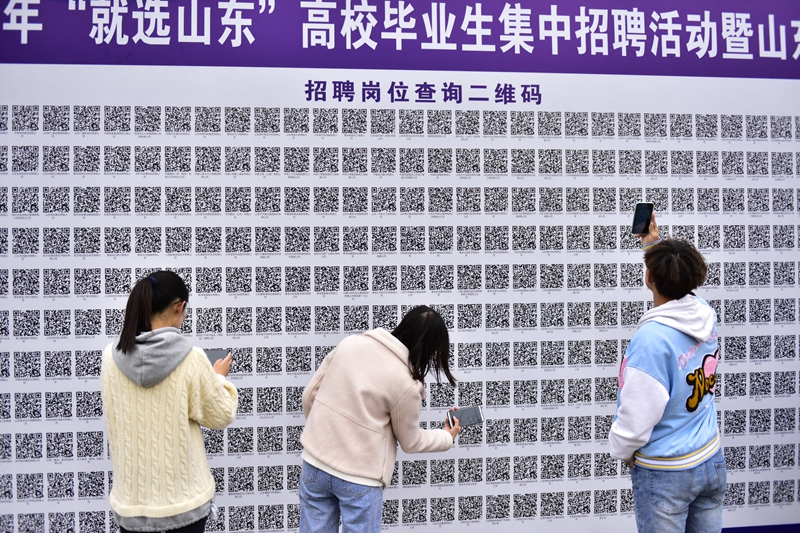 在招聘会现场,一副巨大的二维码海报墙成功吸引了大家的注意。据介绍,针对当代大学生新媒体使用习惯,大学生就业指导中心采取了“扫海报投简历”办法,学生处副处长孔环介绍:“一扫码,什么单位、什么岗位、给多少钱、要多少人一目了然,学生可以当场在手机上填简历。”