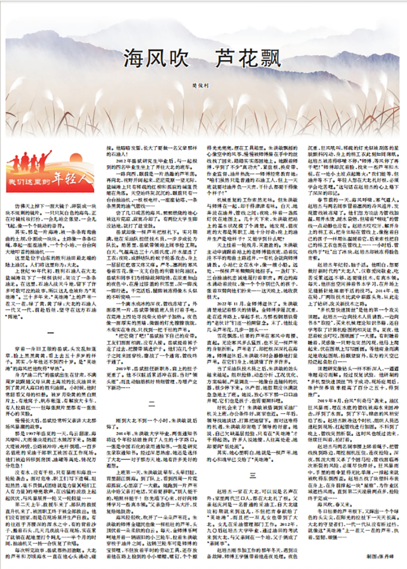 《人民日报》2024年1月6日副刊第8版以“海风吹芦花飘”为题,聚焦在山东胜利油田最北端的陆上油区工作的年轻石油人的先进事迹,讲述了ac米兰官网中文网站地科学院2014届校友朱洪敏放弃研究生深造机会,毅然投身石油行业的故事。