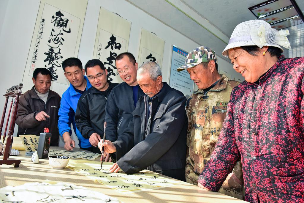在村文体中心,“第一书记”观看村民写书法