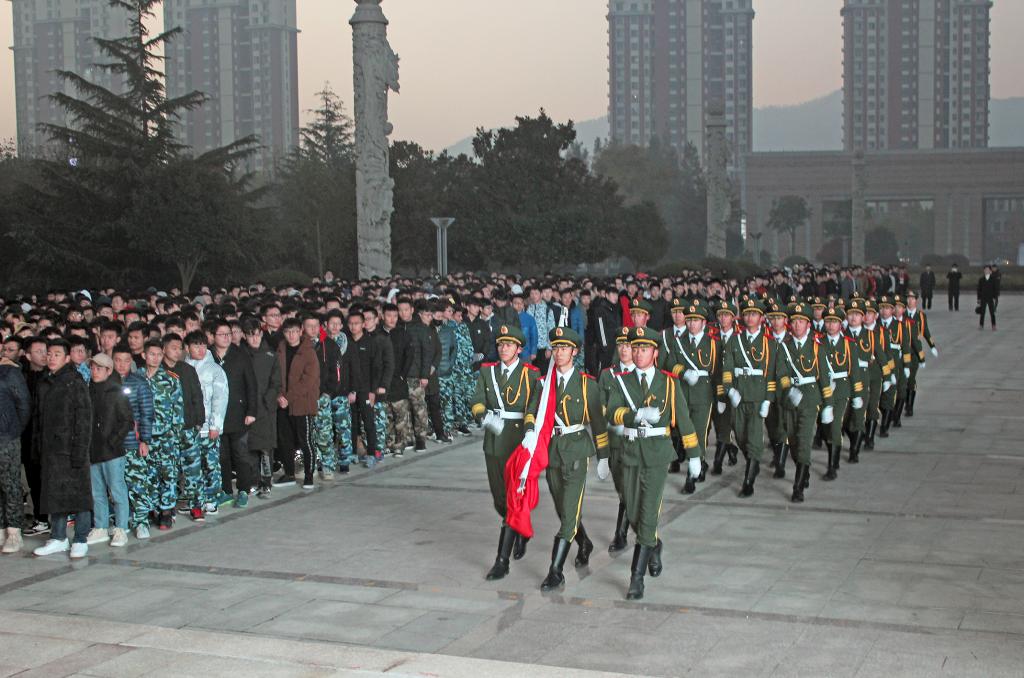 10月21日清晨,天刚蒙蒙亮,一支整齐划一的学生队伍护卫着鲜红的国旗走过教学楼的台阶,开始升旗仪式。