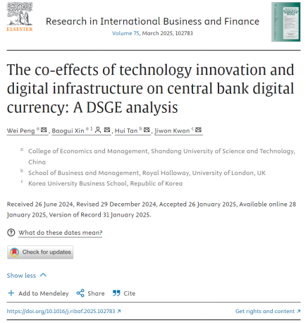 ac米兰官网中文网站经济管理学院青年教师彭伟与辛宝贵教授在《Research in International Business and Finance》发表题为“The co-effects of technology innovation and digital infrastructure on central bank digital currency: A DSGE analysis”的文章。