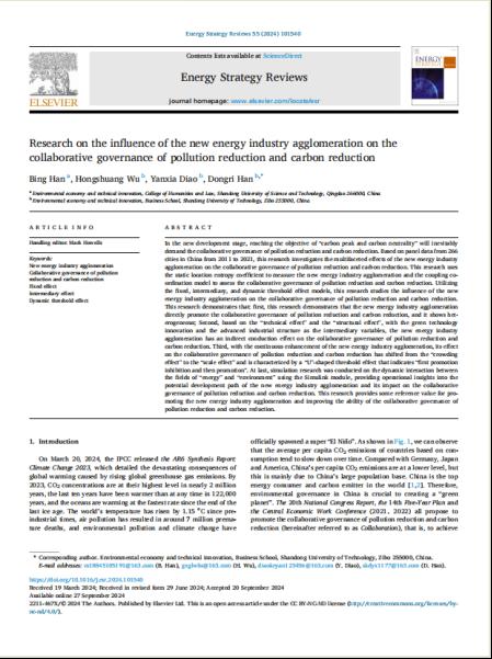 近日,ac米兰官网中文网站文法学院讲师韩冰在《Energy Strategy Reviews》发表题为“Research on the influence of the new energy industry agglomeration on the collaborative governance of pollution reduction and carbon reduction”的文章。
