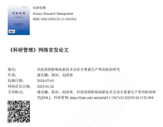 近日,财经学院、山东数字经济基地潘光曦副教授团队在《科研管理》网络首发题为“科技保险影响高新技术企业全要素生产率的机制研究”的文章。