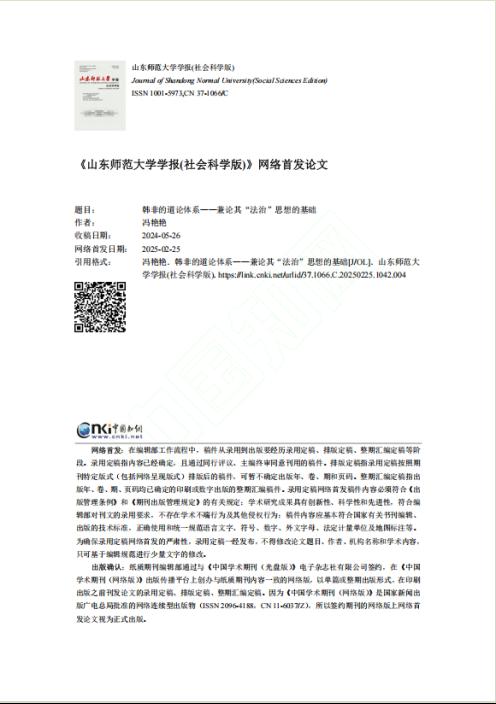 近日,ac米兰官网中文网站文法学院冯艳艳副教授在《山东师范大学学报(社会科学版)》发表题为“韩非的道论体系——兼论其‘法治’思想的基础”的文章。