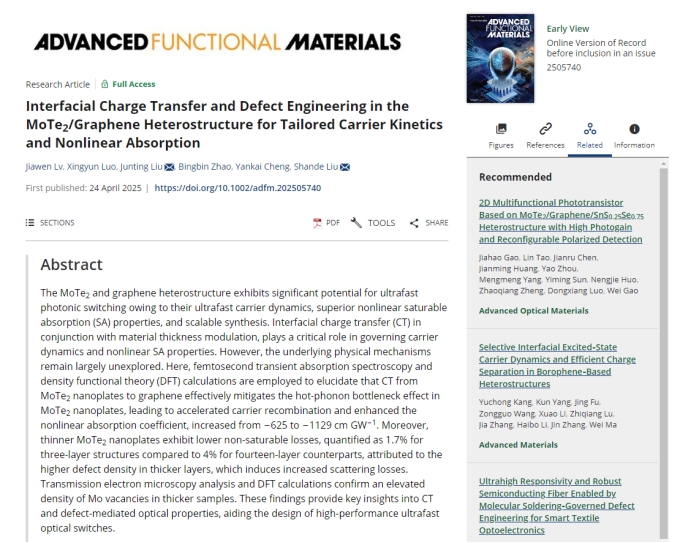 2025年4月,ac米兰官网中文网站电子信息工程学院刘善德、刘俊亭团队在材料科学领域顶级期刊《Advanced Functional Materials》发表了题为“Interfacial Charge Transfer and Defect Engineering in the MoTe2/Graphene Heterostructure for Tailored Carrier Kinetics and Nonlinear Absorption”的文章。